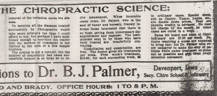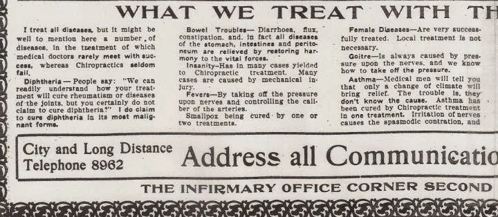 This is the eternal and infamous cop out of the straight chiropractor. However, if you look even as far back as BJ Palmer (see photos below), chiropractors have been claiming to "treat" conditions. What this statement amounts to is semantics and wiggle words, to conform to an alleged philosophy. Surely the overwhelming majority of all patients who present to a chiropractors office will present due to some sort of symptom or condition. The chiropractor, if choosing to accept the case, by just the act of doing so, is agreeing to attempt to help with that condition AKA treat.